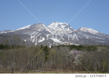 新緑の妙高高原いもり池・残雪の妙高山風景