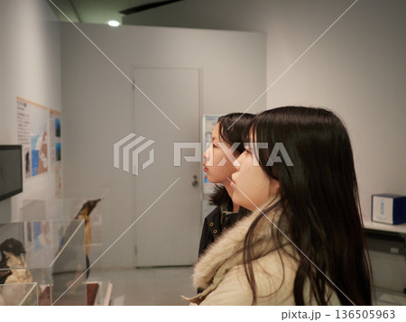 冬休みの中学生姉妹が展示館で見学する様子