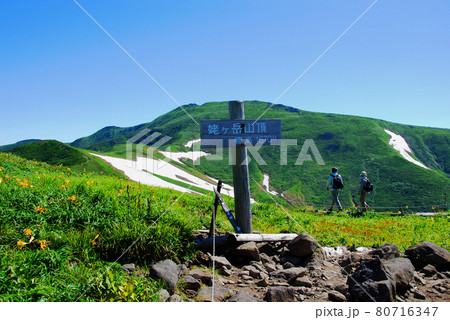 山形県 ニッコウキスゲの咲く姥ヶ岳山頂から月山へ向かう登山者