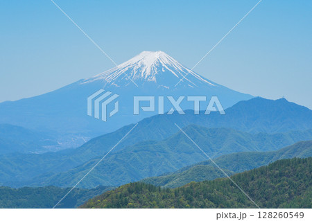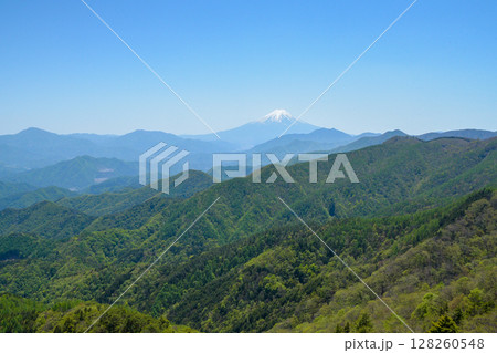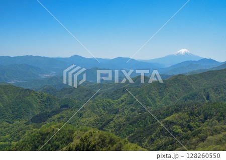 快晴の朝、姥子山山頂から眺める山梨県の山並みと富士山【5月】