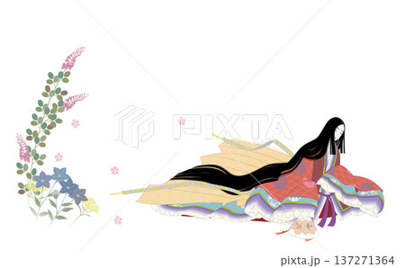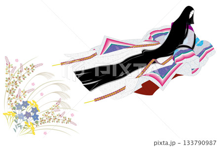 日本の伝統的な着物の正装の十二単衣の衣装。振り返る高貴な女性と秋草。