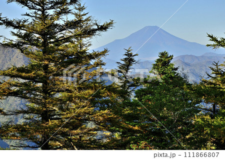 丹沢の姫次展望台より カラマツの黄葉に富士山を望む