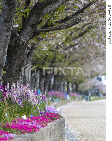 川沿いの堤防道路に咲く桜と花壇の花