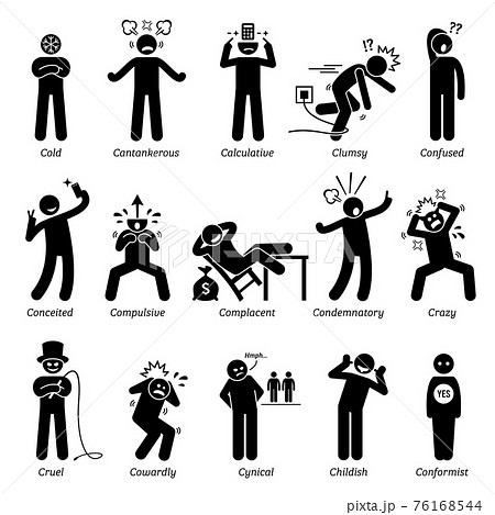 Negative Personalities Character Traits. Stick Figures Man Icons. Starting with the Alphabet C.