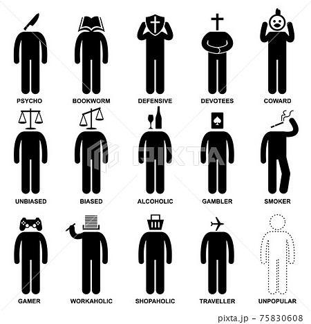 Man Characteristic Behaviour Mind Attitude Identity Stick Figure Pictogram Icon. A set of pictogram representing the characteristic, behaviour, mind, attitude, identity, and personalities of a person.