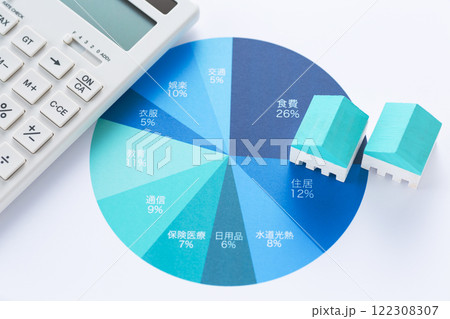 一ヶ月の生活費の内訳グラフと電卓と住宅