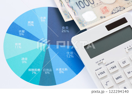 一ヶ月の生活費の内訳グラフと電卓とお金