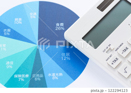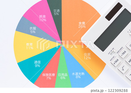 一ヶ月の生活費の内訳グラフと電卓と住宅