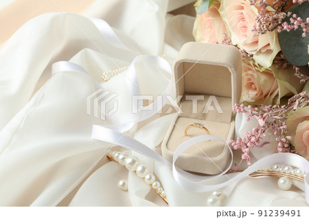 Concept of wedding accessories with wedding ring, close up