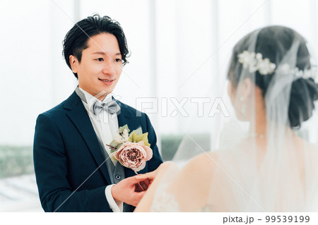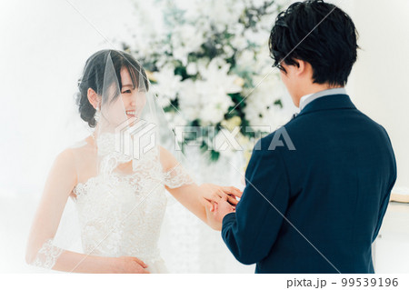 結婚式場で指輪交換する新郎新婦(結婚指輪・マリッジリング・・ウェディング・ブライダル)