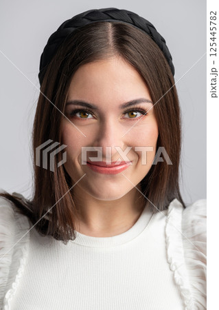 Close-up beautiful woman with long dark hair and headband portrait