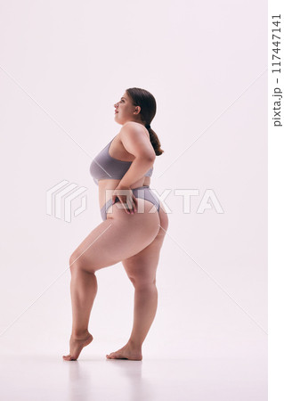 Full-length portrait of overweight woman posing in grey underwear, shows her confidence against white studio background.