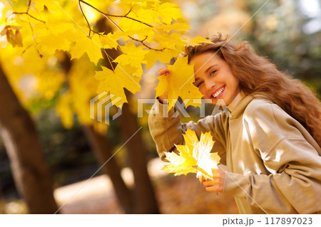 Smiling young woman enjoys the autumn weather at the maple tree with the yellow leaves at sunset