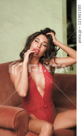 Beautiful brunette posing sexy on camera in red lace bodysuit while sitting on sofa