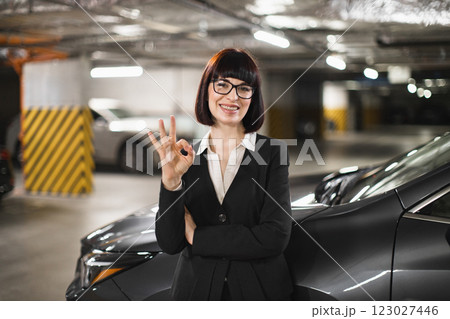 Confident Caucasian woman in her 30s wearing glasses shows ok sign while smiling in parking garage beside luxury car, conveying success and positivity.