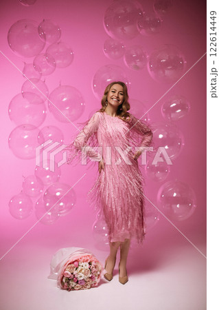 Alluring young female model fashion beauty portrait. Elegant woman with long blond curly hairstyle