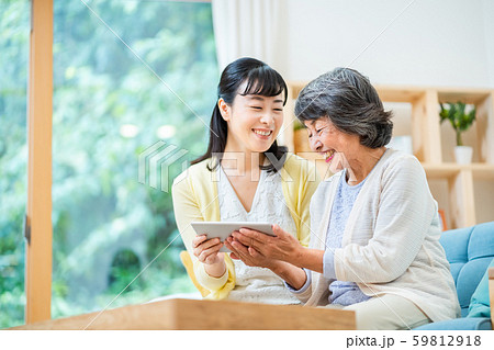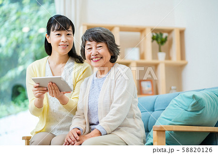 タブレット端末を操作する親子 母子 シニア女性 ミドル女性 2人