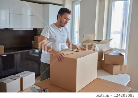 Man standing in living room on day of move to rented home, unbox carton box with belongings. Relocate to new own apartment collect personal things