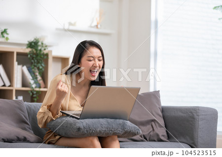 Entrepreneur of beautiful business asian young woman working online with laptop and celebrating at home with her work success cheerful and happiness. Small Business Startup concept