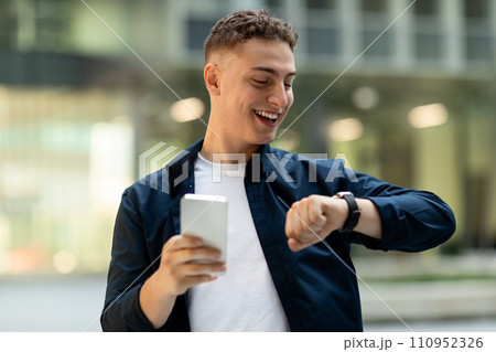 Glad busy handsome millennial caucasian man in casual typing on phone, enjoy chat in social networks