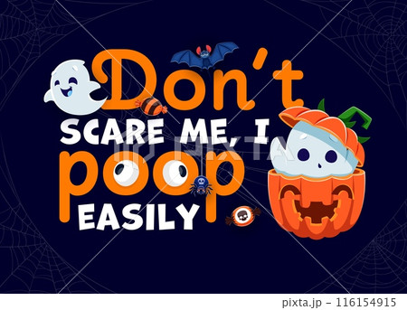 Halloween quote, Do Not Scary Me, I Poop Easily with funny ghost and pumpkin, cartoon vector for holiday. Halloween t-shirt print with cute kawaii boo ghost characters, spider and trick or treat candy