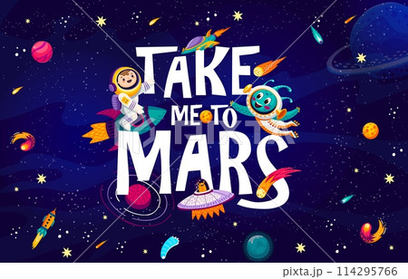 Space quote take me to Mars and cute galaxy characters vector typography. Cartoon astronaut, alien, rocket, spaceship and UFO in dark space. Starry galaxy background, planets, stars, astronomy quote