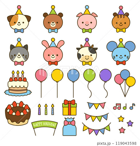 かわいい動物の顔と誕生日パーティー用デザイン素材セット