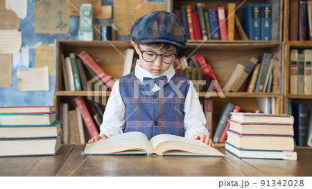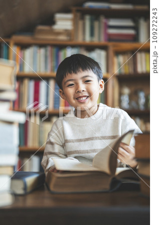 読書 イメージ カメラ目線で笑顔の7歳の男の子