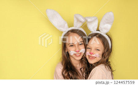Funny girls in Easter bunny costumes hugging on a bright yellow studio background. Holy Easter Day