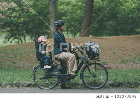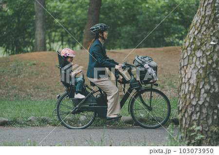 可愛的小朋友在公園裡騎腳踏車背對鏡頭望向前方