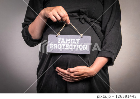 Pregnant Woman Holding Family Protection Sign for Maternity and Parental Care Concept