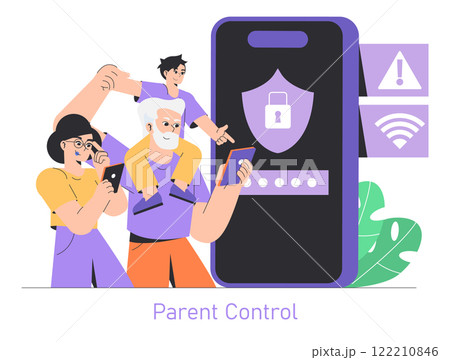Safety Internet Day concept. Illustration of a family engaging with parental controls on devices for secure online activity. Promoting cybersecurity awareness. Vector illustration.
