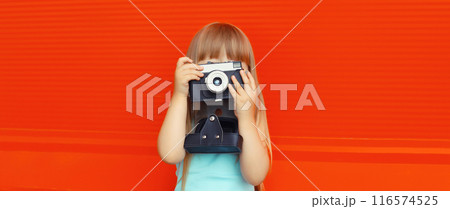Little child with film camera, kid taking picture on bright red background