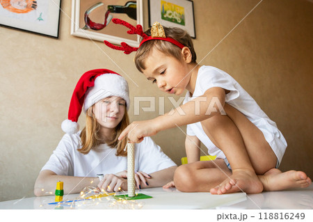 Children at home on New Year's Eve chatting with each other at table. Merry Christmas Happy New Year