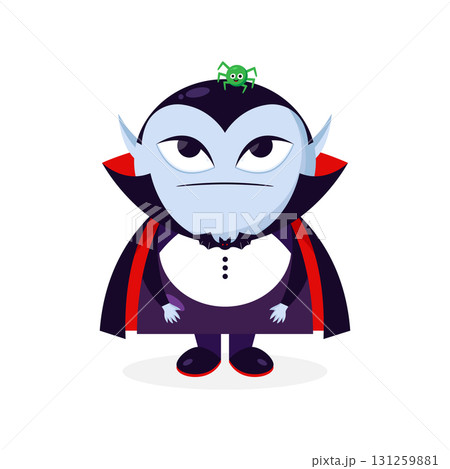 Cute cartoon Dracula vampire with a spider on his head. Dracula character. Vector illustration