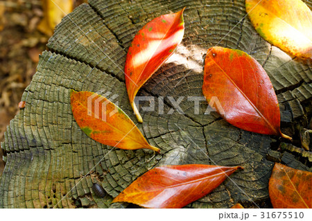 木の板の上に置かれた落ち葉のイメージ素材 赤・黄・緑色
