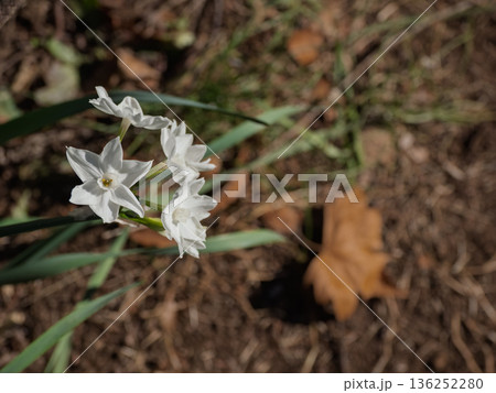 落ち葉の中で咲く白い水仙 ペーパーホワイト(冬から春へ)