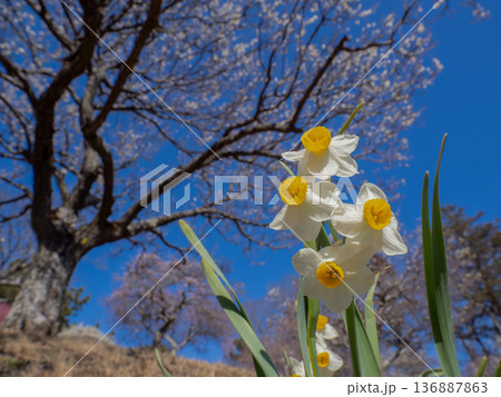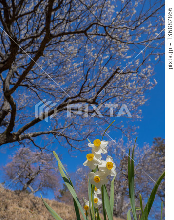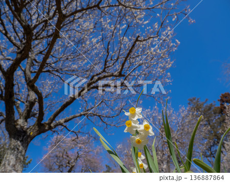 梅と水仙が同時に咲く早春の情景 青空に広がる季節の共演