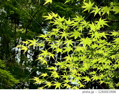 光を浴びて輝く新緑の若葉