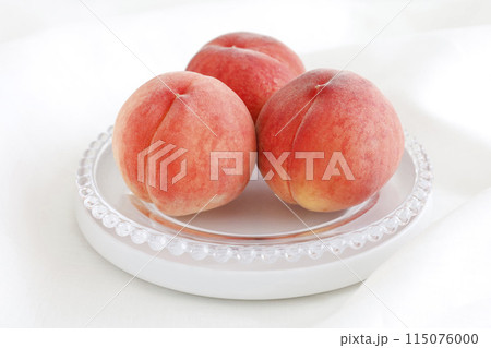 皿に盛られた美味しそうな桃 ドレープ布の白背景