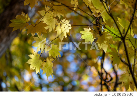 逆光に透ける紅葉したカエデの葉と秋空のボケ感(和風・自然背景)
