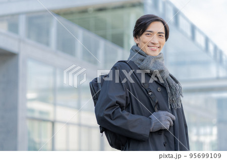冬の都市の街で歩く若い男性サラリーマンの姿