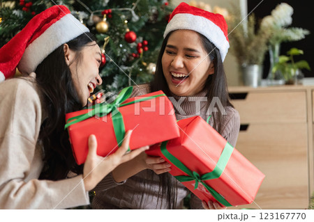 Happy Lesbian Couple Celebrating Christmas Together with Gifts and Joyful Smiles in a Festive Holiday Setting