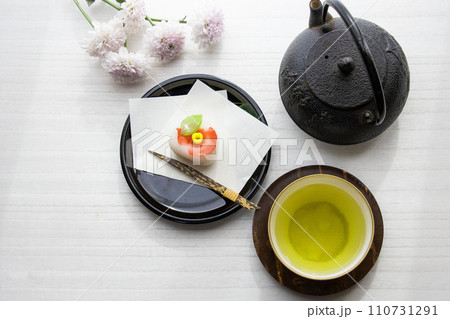 黒塗りの丸皿ののった上品な和菓子と緑茶