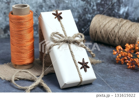 Decorative Gift Box Wrapped with Twine and Accompanied by Colorful Thread and Flowers