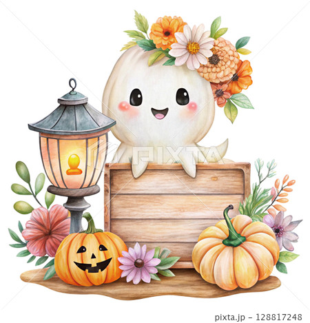 Cute kawaii ghost hugging a smiling jack o lantern pumpkin sign wooden