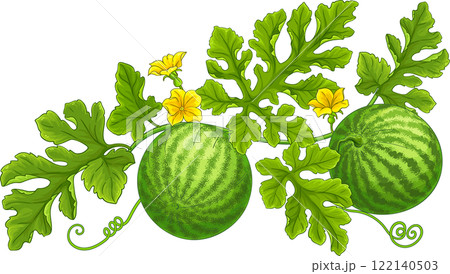 Watermelon Plant with Flowers, Fruits and Leaves Colored Detailed Illustration.