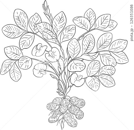 Peanut Plant with Flowers, Nuts and Leaves Outline Illustration. Organic natural nutritional healthy food ingredient, vegetarian diet product.