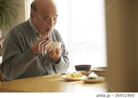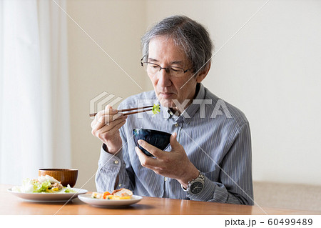 人物 寂しい表情をうかべながら孤食するシニア男性