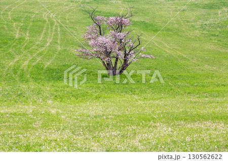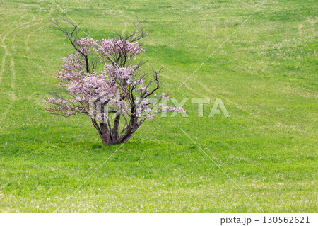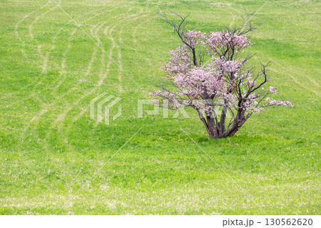 室蘭の芝生に咲く一本桜